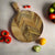 Elevate your kitchen aesthetics with this beautifully crafted wooden chopping board, featuring a striking chevron inlay pattern. Made from high-quality, food-safe hardwood, this round board combines durability with style. Its integrated handle with a hanging hole adds functionality, making it perfect for chopping, serving, or displaying artisanal cheeses and snacks. Whether in use or on display, it brings a touch of rustic elegance to any culinary space.