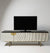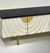 The Sunrise Wave Credenza is a contemporary storage unit that combines artful design with functionality. The standout feature is its sculpted front façade, showcasing a series of elegant, concentric arc grooves that evoke the imagery of rippling waves or a rising sun. This textured detail is subtly enhanced by a partial golden semicircle inset, adding a touch of opulence and symmetry. A black matata marble top, adds contrast and a premium feel and brushed gold cylindrical legs, which lend mid-century modern flair and sturdy support