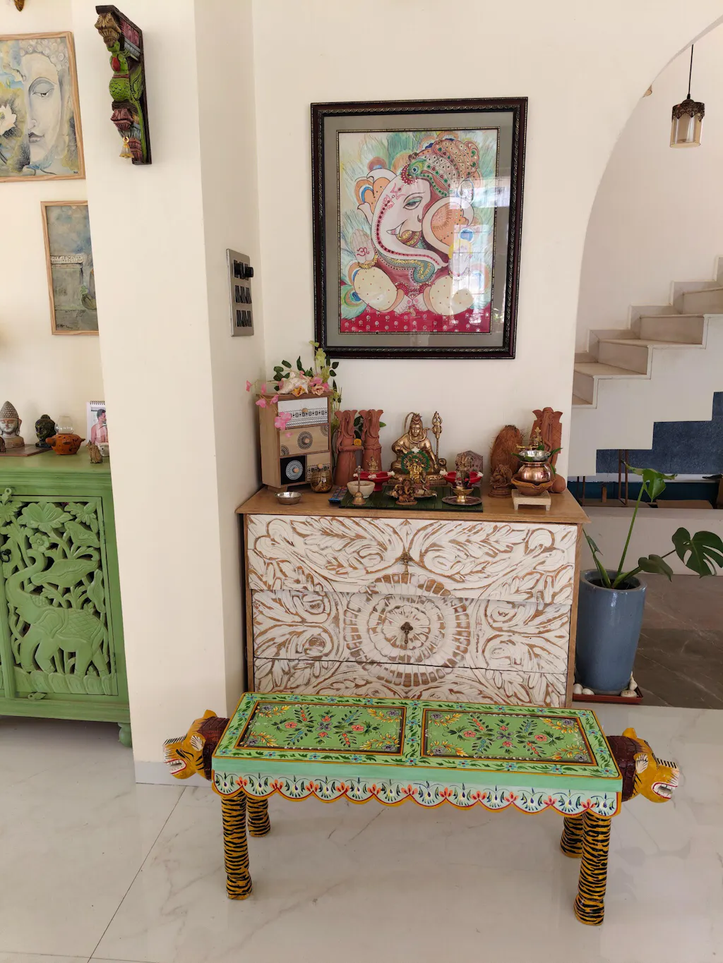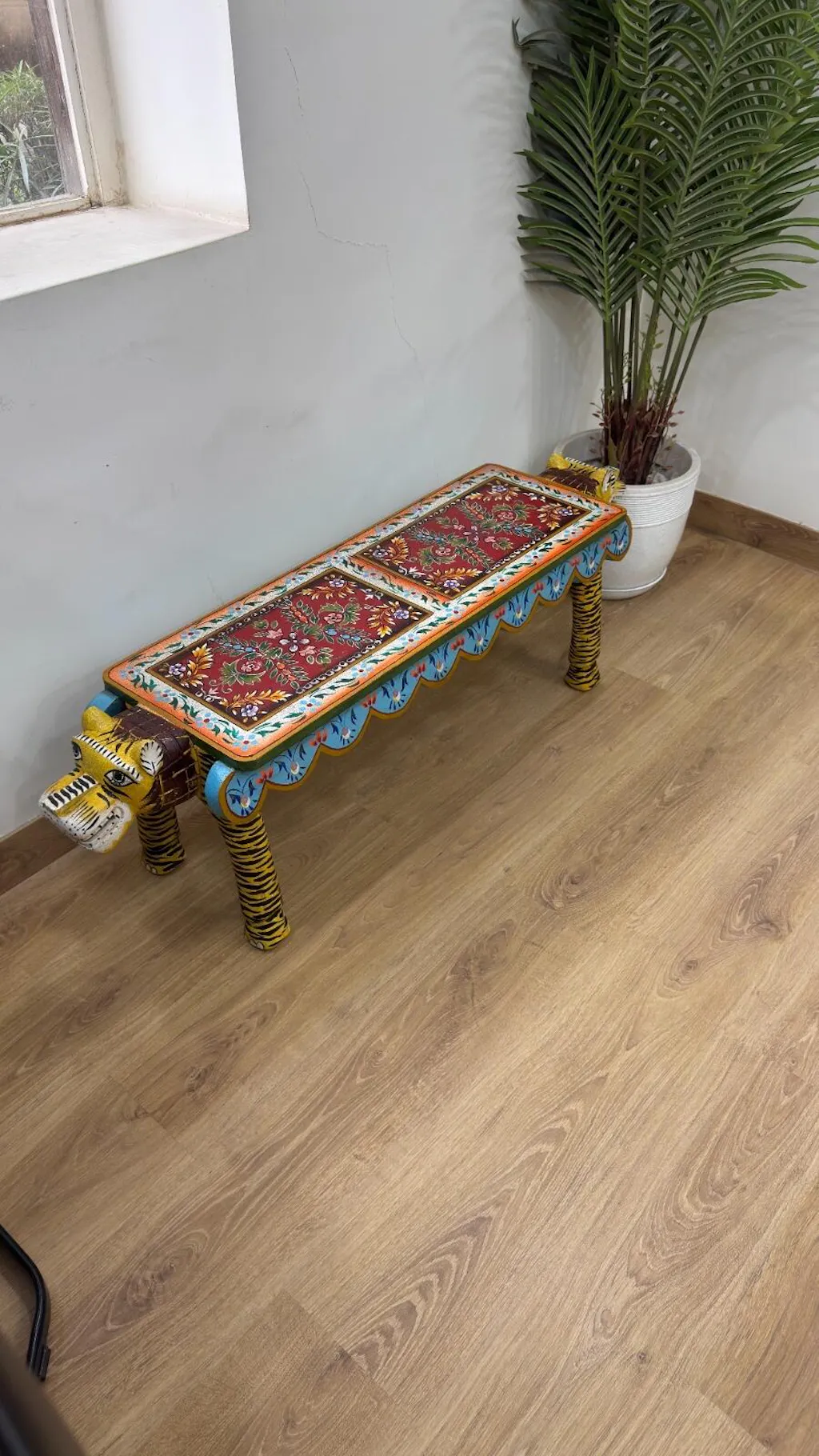 Infused with folk artistry and royal symbolism, the Tiger Throne Bench is a bold tribute to traditional Indian craftsmanship. Hand-carved from solid wood, this bench features elaborately painted florals on the seat, scalloped edges, and whimsical tiger heads at both ends — symbolizing power, protection, and regal strength. With its vivid colors and crackle finish design, it functions beautifully as a decorative bench, an accent table, or a statement piece in eclectic interiors.